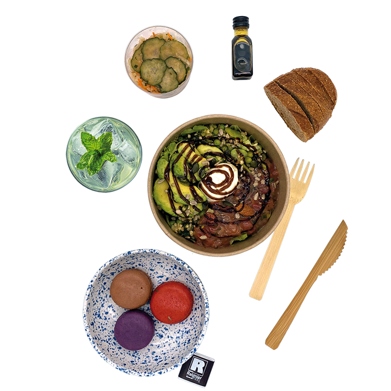 Nos couverts sont en bambou. Nos box de transport, nos bols et nos gobelets sont en carton recyclable.