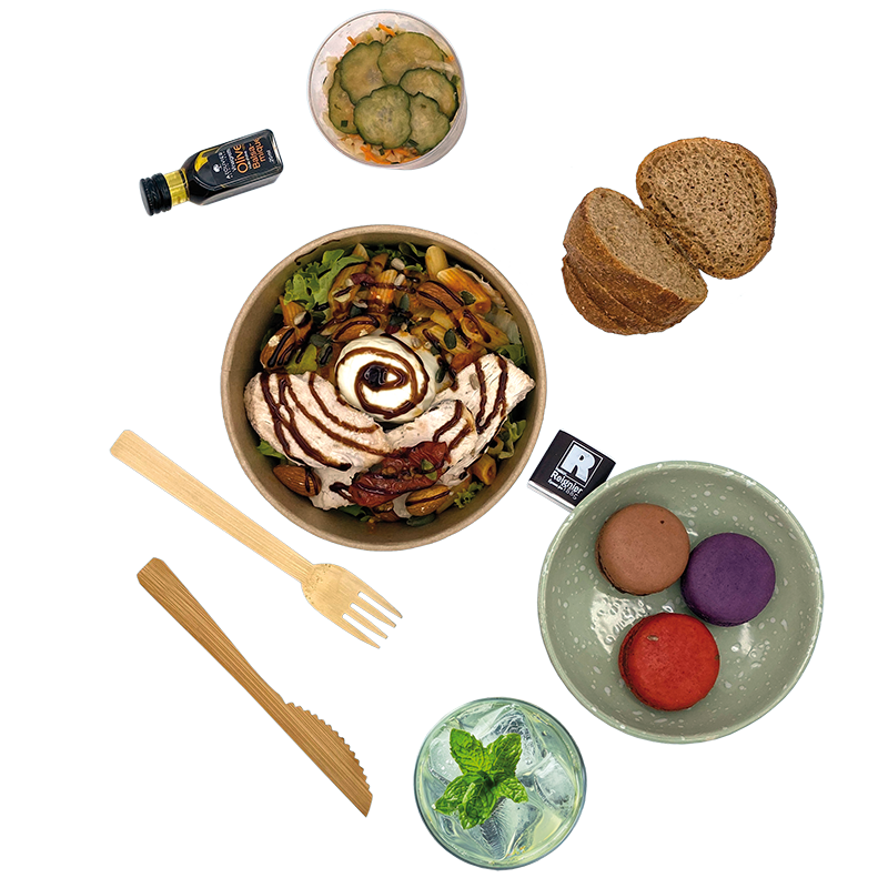 Nos couverts sont en bambou. Nos box de transport, nos bols et nos gobelets sont en carton recyclable.